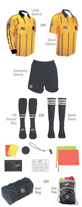 Economy USSF Short or Long Sleeve Shirt, Economy Shorts, Basic Socks, Red/Yellow Card Set, Data Wallet, Scorepad, Velcro Disk, Whistle, Wrist Lanyard, Flag Set, choice of either the Essential Sac Pak or Official Roll. Shirt: YL, S, M, L, XL, XXL Shorts: YL, S, M, L, XL, XXL. No substitution or partial returns on kits. Starter Kit Orders will only be processed if all kit components are in the cart: Kit Item, Shirt, Shorts, Socks, and Bag.